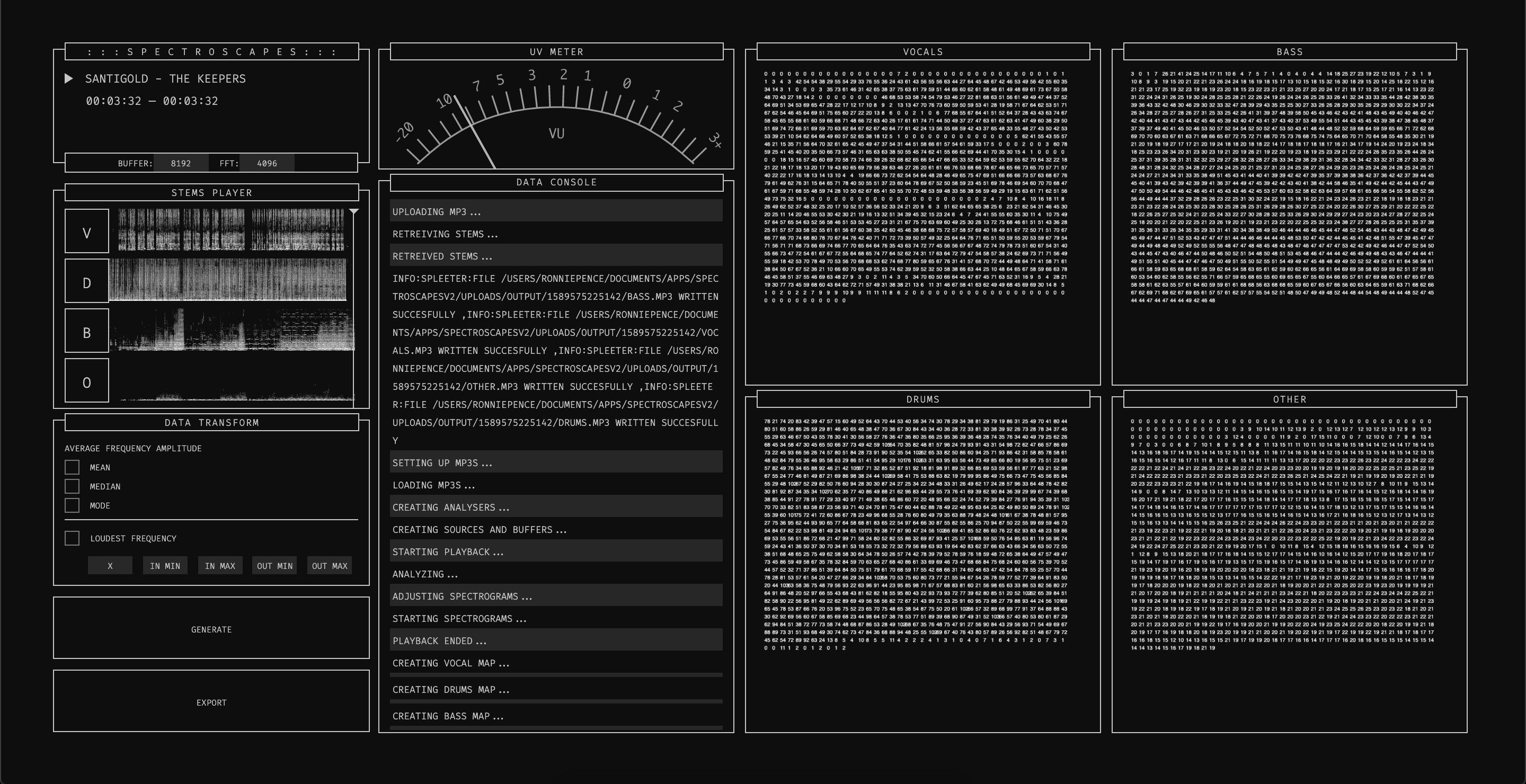 A custom piece of software was developed for this project, visualizing data and audio forms through spectrogram, VU meters, and algorithmic heatmaps that compose the generated spectroscape which is in turn visualized through a 3D rendered plane. The software was released for free use at spectroscapes.com and was utilized by thousands of individuals to create Spectroscapes of their favorite songs.